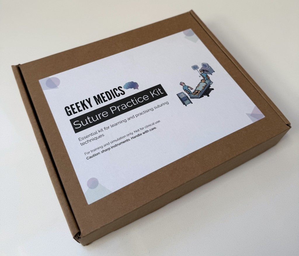Practise essential suturing techniques with the Geeky Medics suture practice kit, featuring a realistic silicone suturing pad, stainless steel instruments, sutures and step-by-step guides.